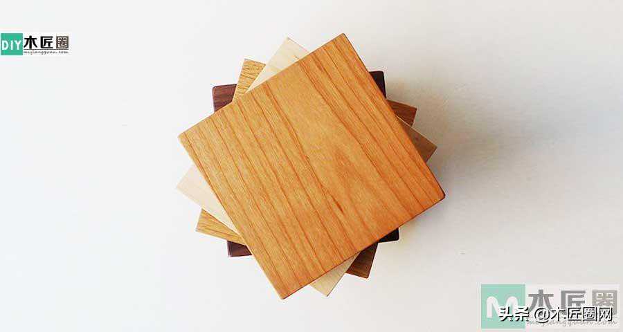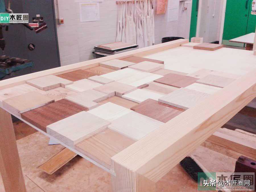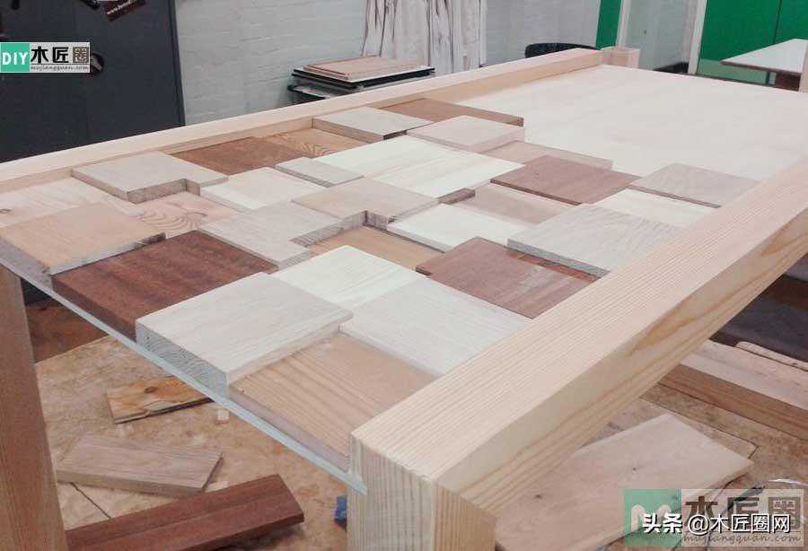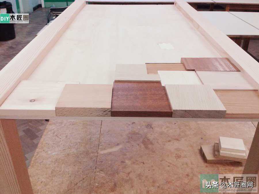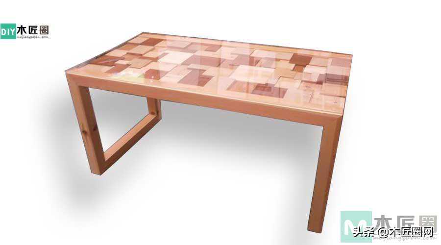 在茶几底板上用一块块方形木板拼接镶嵌,方木块大小和厚度都不一样(如图),所以在拼接的时候会有四角重叠现象。因此拼接的时候要锯掉重叠部分的木块,这样大小和厚度不一的无缝拼接就会显得很有立体感,再盖上玻璃时,加上玻璃的折射原理,看上去这款茶几更加显得有逼格。
