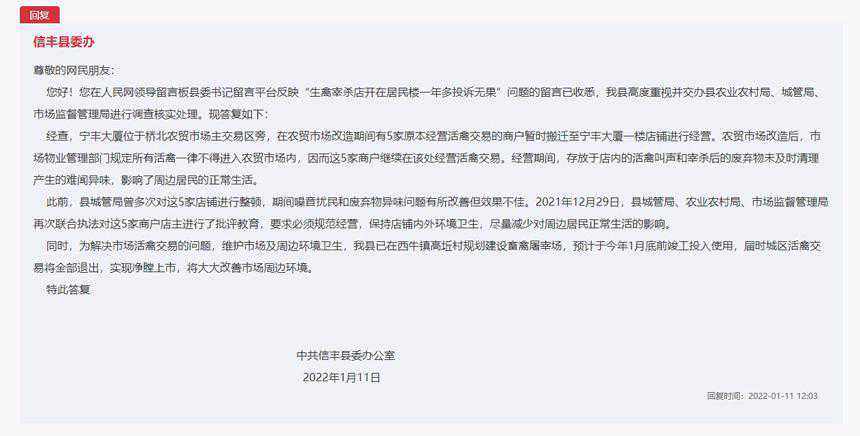 “2020年9月赣州市信丰县桥北市场改造,导致原本在菜市场内的数家商贩集体搬迁到宁丰大厦居民楼底层商铺继续经营。每天凌晨四点起鸡鸭鹅狗哀嚎不断,蚊苍飞舞臭气熏天,严重影响了我们的正常生活。”网友通过人民网“领导留言板”向江西省赣州市信丰县委书记留言,希望能迁走自己所住居民楼的生禽宰杀店。