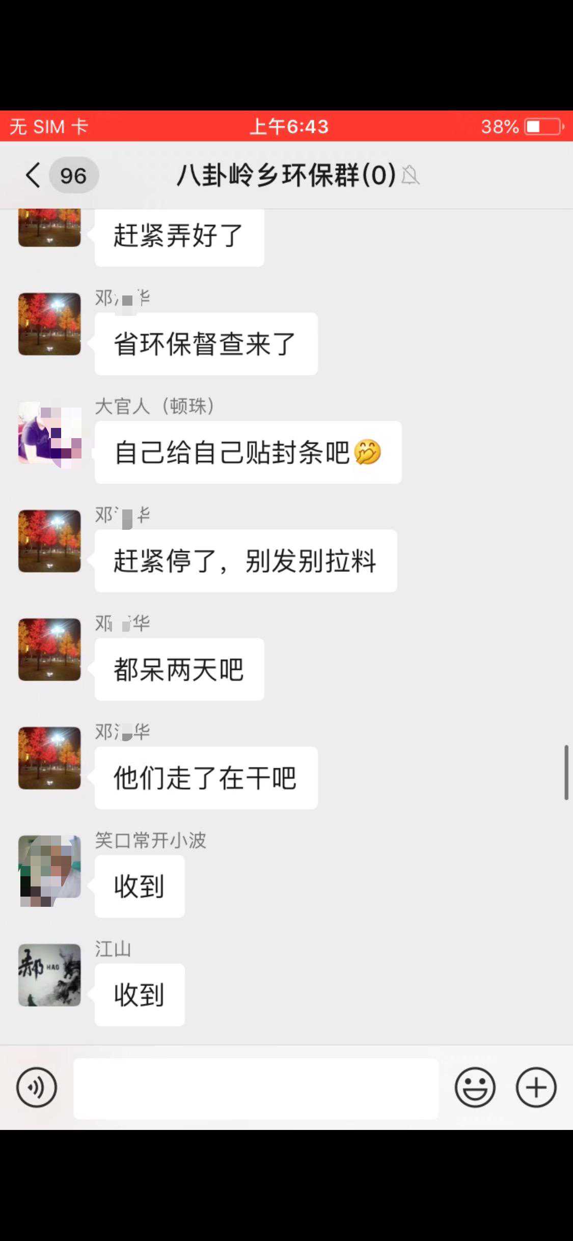 在李先生提供的微信群聊天记录截屏中,新京报记者看到,5月13日13时14分,一名为“八卦岭乡环保群”中,邓某华发言称,“所有人,下午县领导要来我乡检查,即刻起所有人不准发料,拉料,如不服从领导将予重罚。”随后所有人回复“收到”。