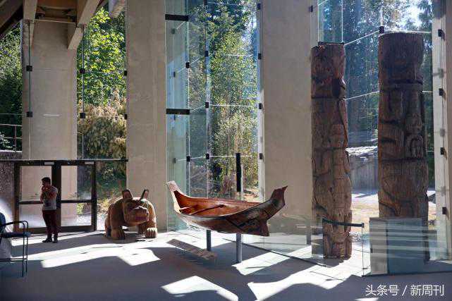 温哥华人类学博物馆里的展示的图腾柱和独木舟。(图/李伟)