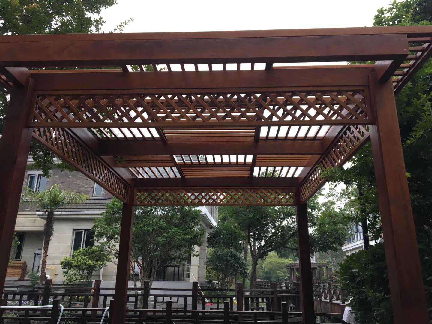 目前,主要承建的户外防腐木花架有以下几种形式:①廊式花架。常见的形式,片板支承于左右梁柱上,游人可入内休息。②片式花架。片版嵌固于单向梁柱上,两边或一面悬挑,形体轻盈活泼。③独立式花架。以各种材料作空格,构成墙垣、花瓶、伞亭等形状,用藤本植物缠绕成型,供观赏用
